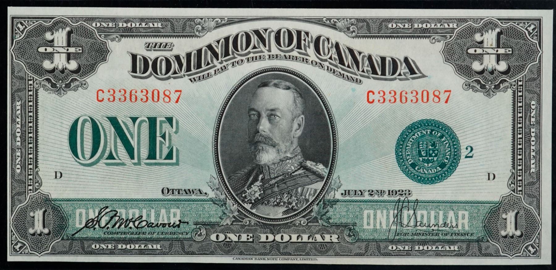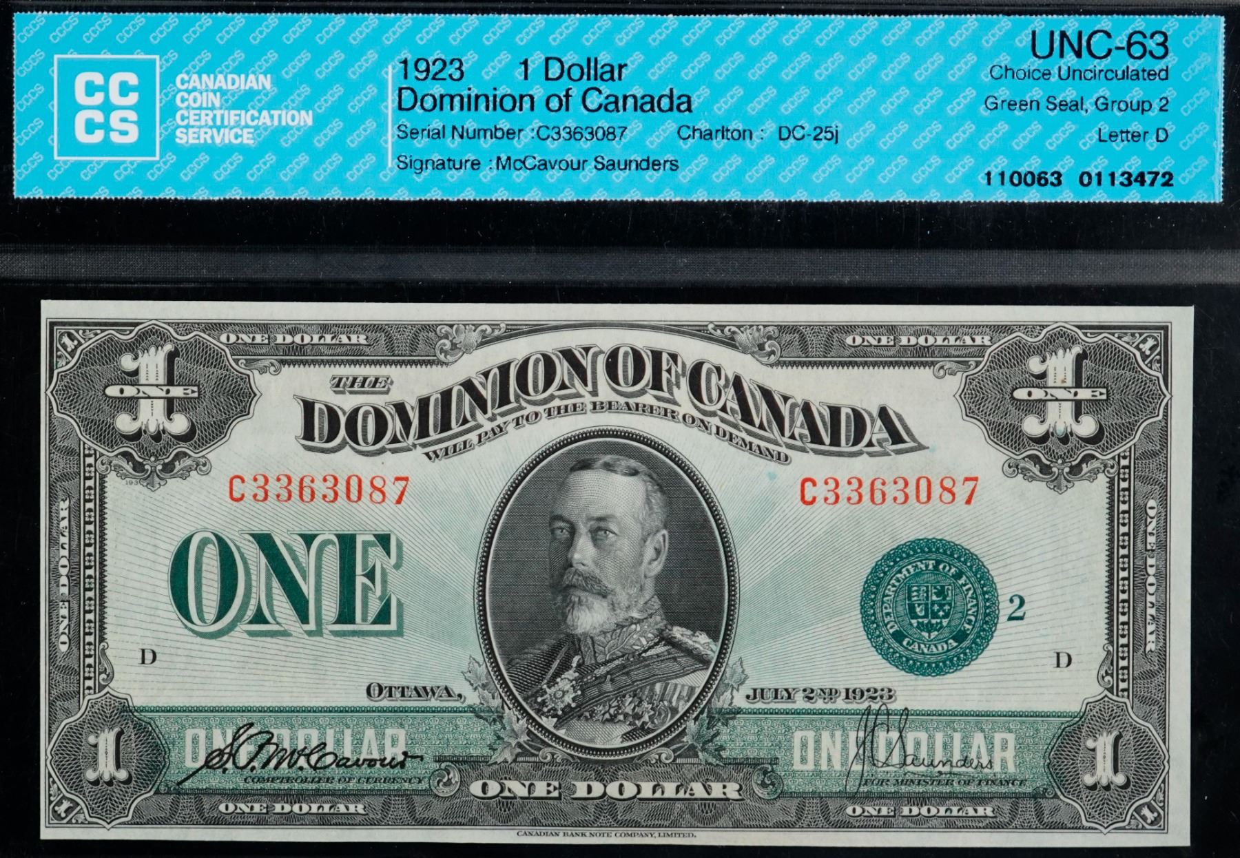 1923 $1 DC-25j C3363087 "Green Seal" CCCS Choice Uncirculated-63. This is a bright, clean and attractive issue with nice eye appeal.