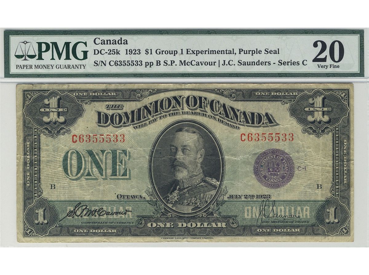 1923 $1 DC-25k, #C6355533, PMG VF20. RARE Purple seal issue.