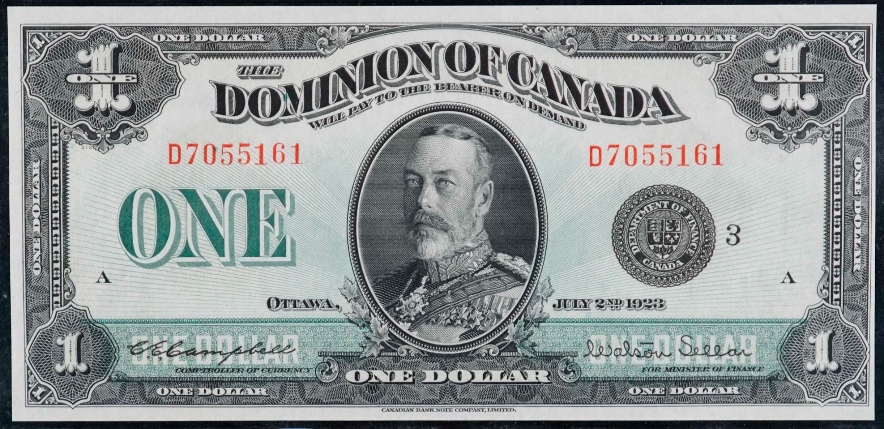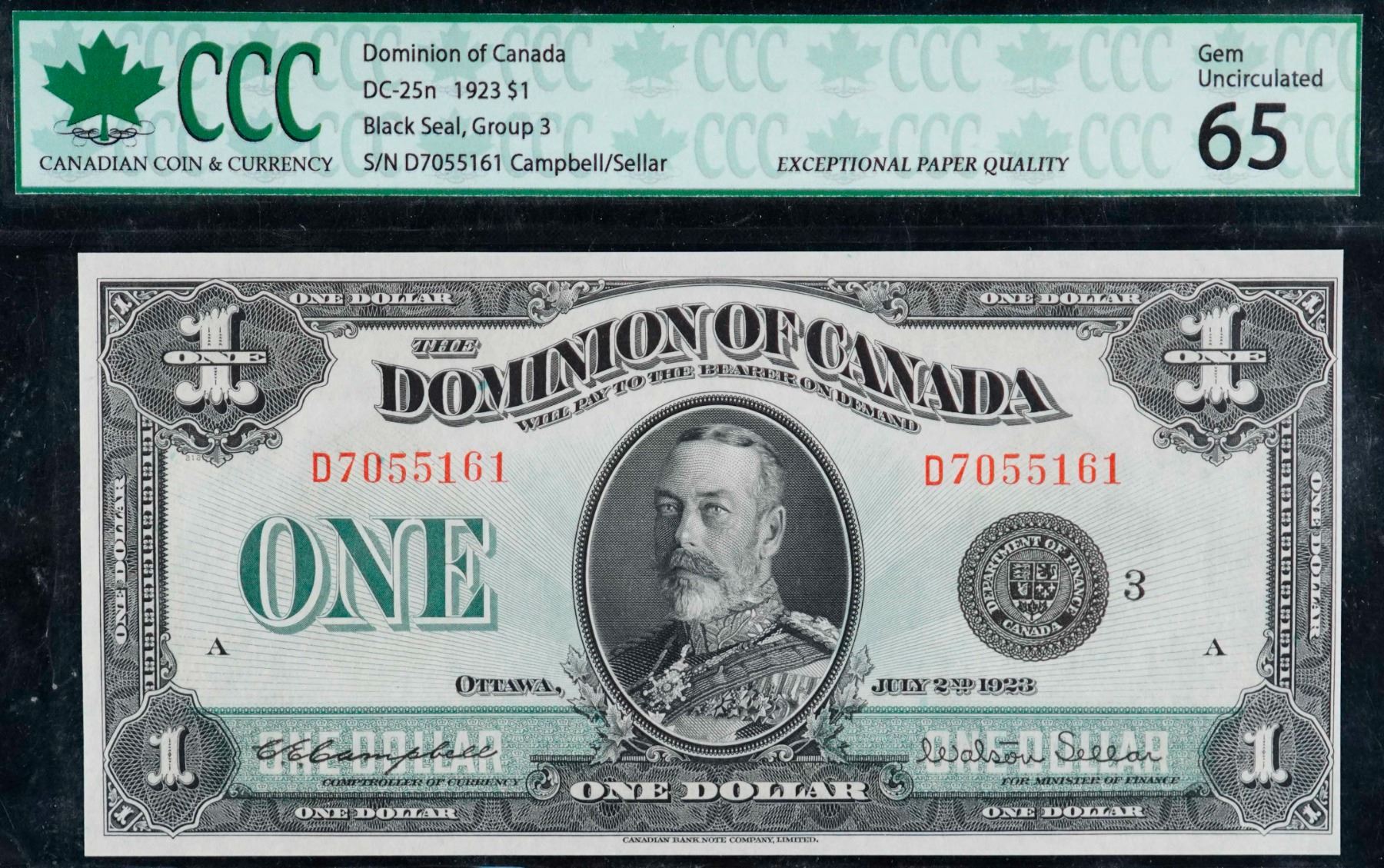 1923 $1 DC-25n #D7055161 CCC Gem Uncirculated-65. This is a pristine issue with great eye appeal, good margins and superb embossing.