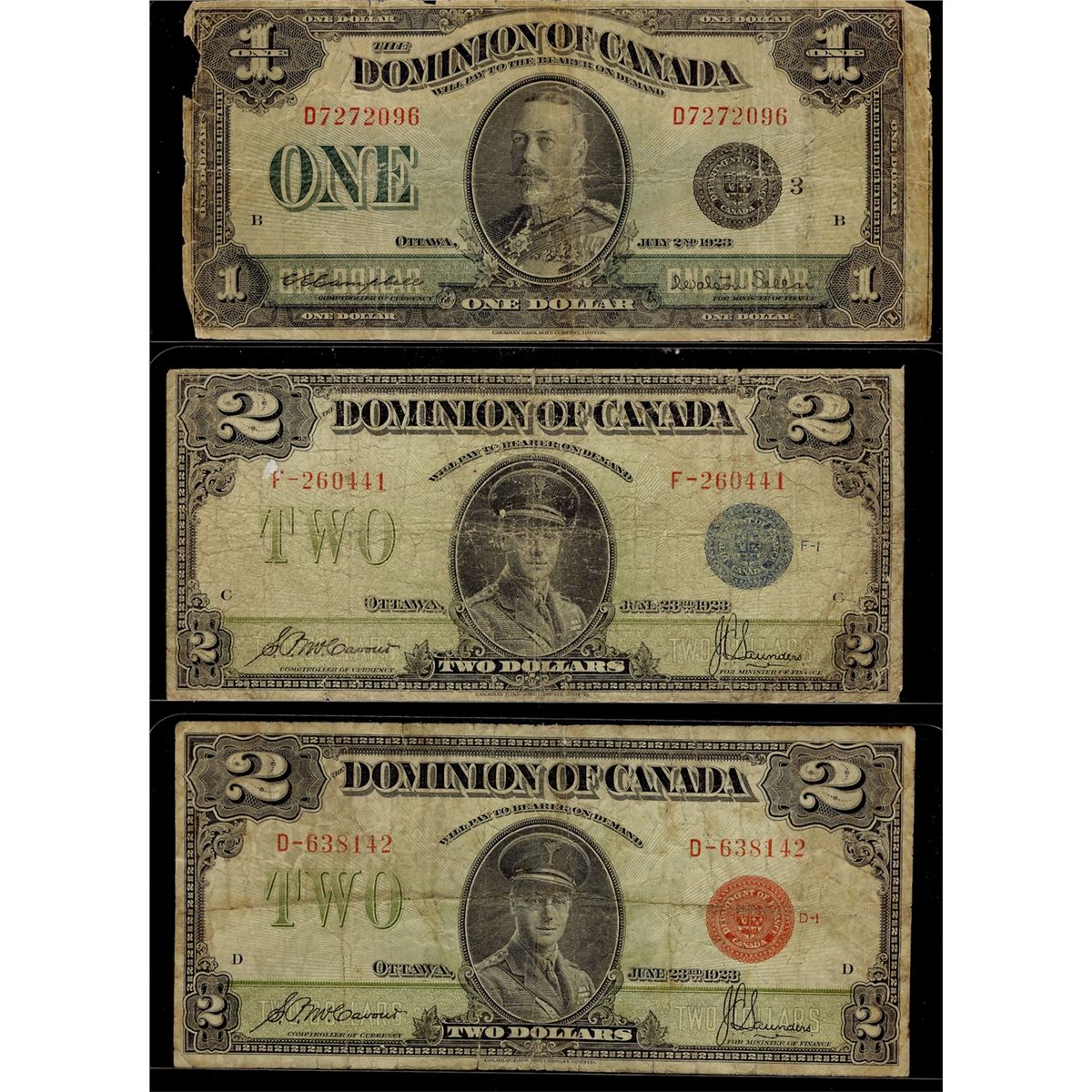 1923 $1 DC-25n Good, $2 DC-26c & DC-26b. Lot of 3 notes Good to VG.