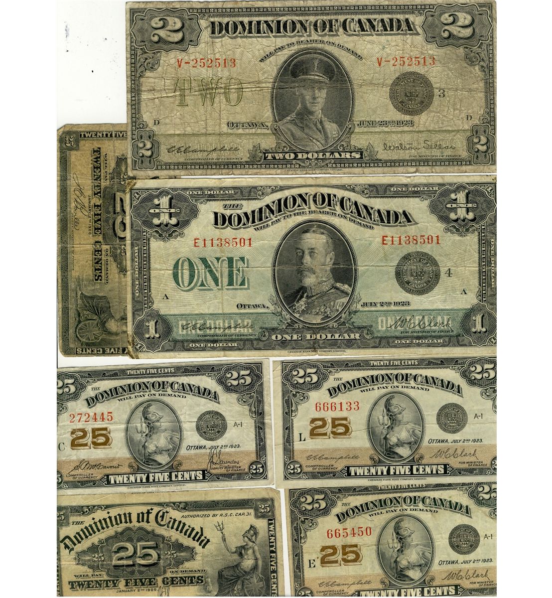 1923 $1 DC-25o, $2 DC-26l, 1900(2) & 1923(3) Shinplasters. Small lot of 7 notes VG to Fine+.