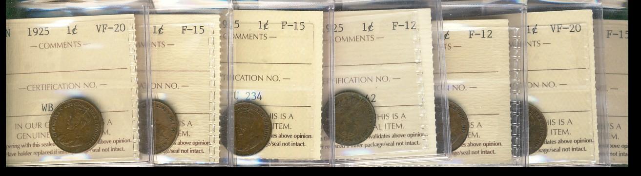 1923 1¢ F15, VF20, 1925 F12(2), F15(2) & VF20. Lot of 7 coins all ICCS graded.