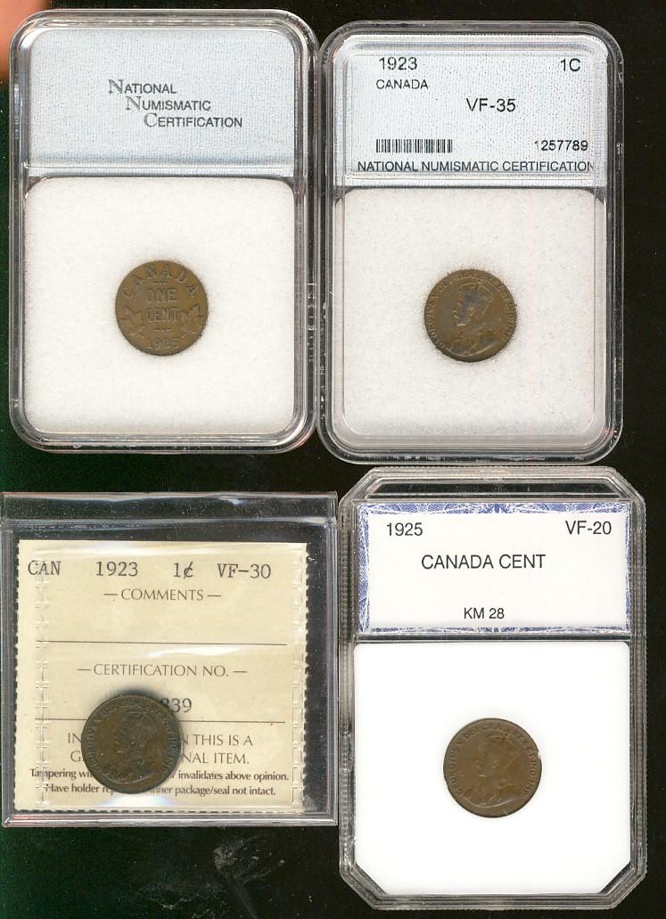 1923 1¢ ICCS VF30, NNC VF35 & 1925 PCI VF20, NNC VF30. Lot of 4 problem free coins.