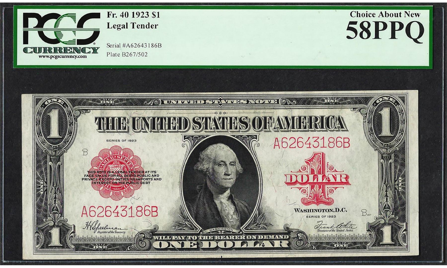 One 1923 $1 Legal Tender Note Fr.40 PCGS Choice About New 58PPQ. PCGS Graded.