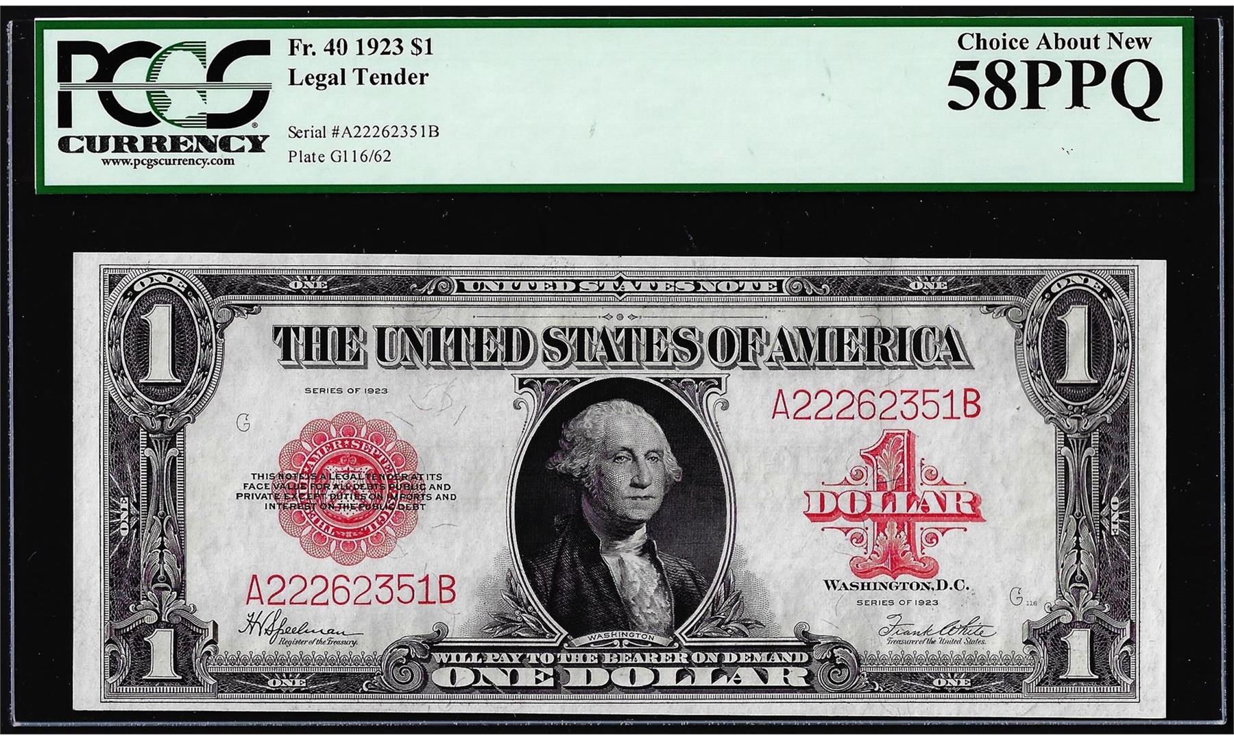 One 1923 $1 Legal Tender Note Fr.40 PCGS Choice About New 58PPQ. PCGS Graded.
