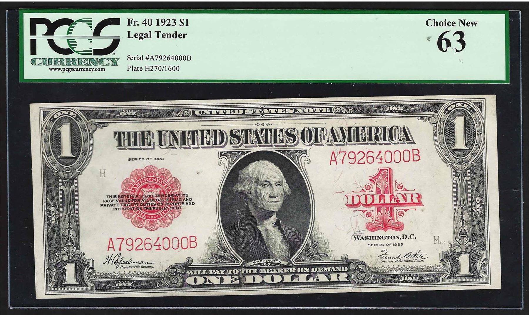 One 1923 $1 Legal Tender Note Fr.40 PCGS Choice New 63. PCGS Graded.