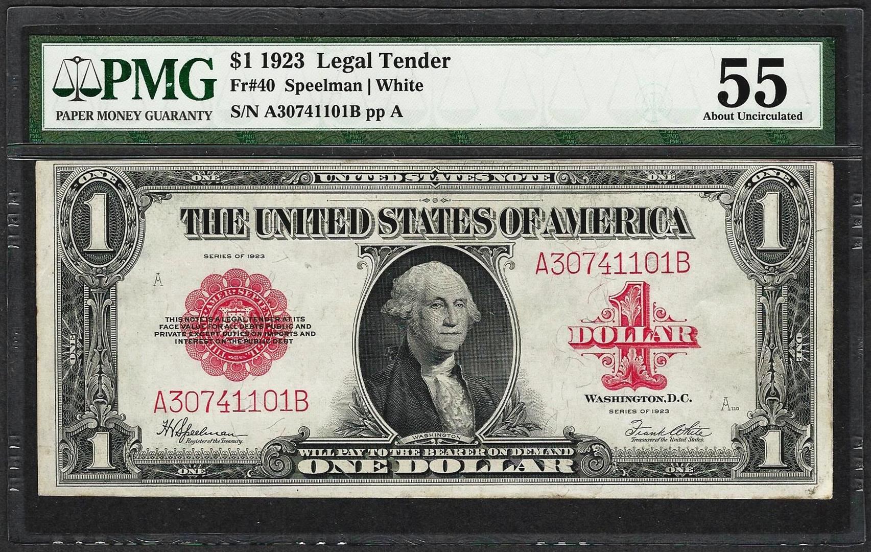 One 1923 $1 Legal Tender Note Fr.40 PMG About Uncirculated 55. PMG Certified.