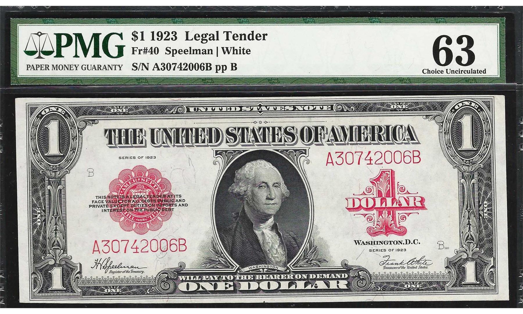 One 1923 $1 Legal Tender Note Fr.40 PMG Choice Uncirculated 63. PMG Certified.