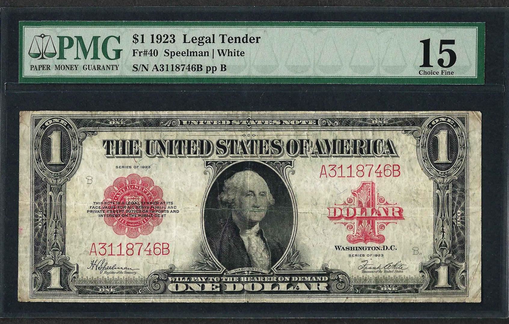 One 1923 $1 Legal Tender Note Fr.40 PMG Fine 15. PMG Certified.