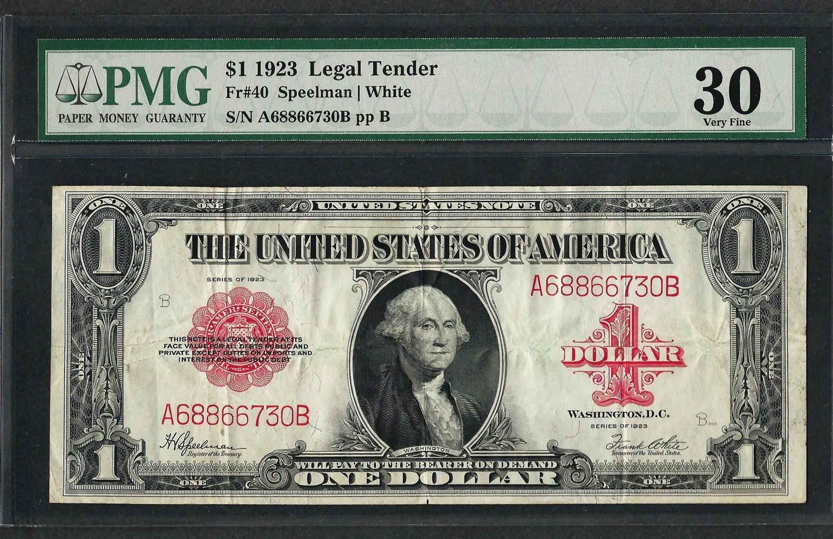 One 1923 $1 Legal Tender Note Fr.40 PMG Very Fine 30. PMG Certified.