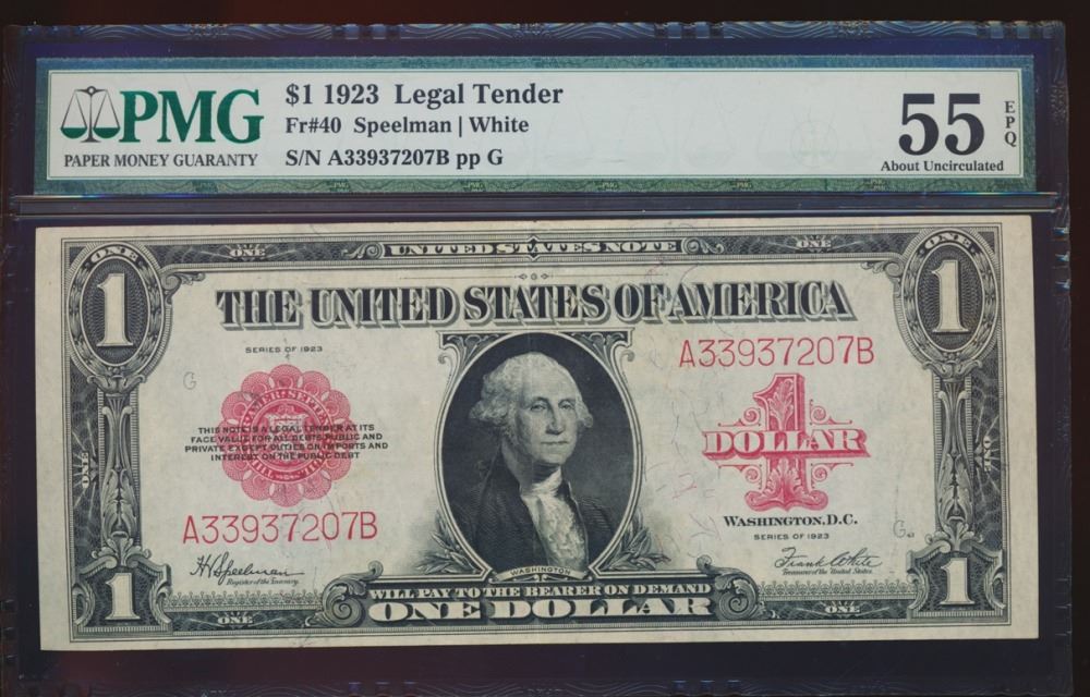 One 1923 $1 Legal Tender Note PMG 55EPQ.
