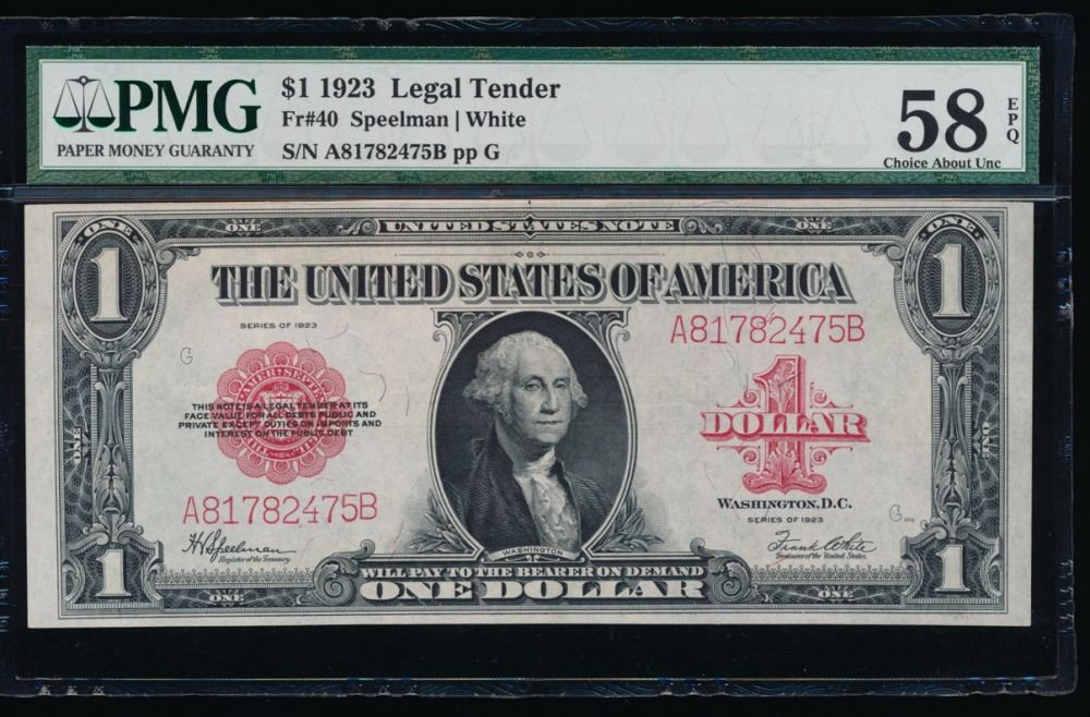 One 1923 $1 Legal Tender Note PMG 58EPQ.