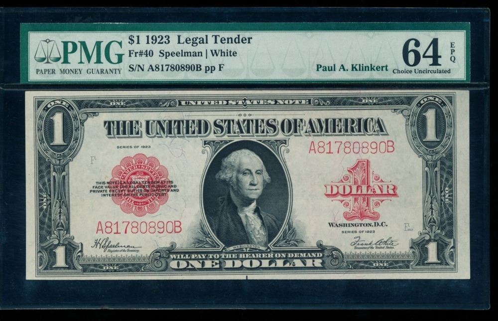 One 1923 $1 Legal Tender Note PMG 64EPQ.