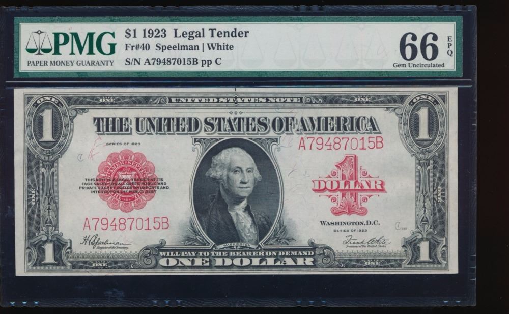 One 1923 $1 Legal Tender Note PMG 66EPQ.