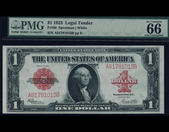 One 1923 $1 Legal Tender Note PMG 66EPQ.