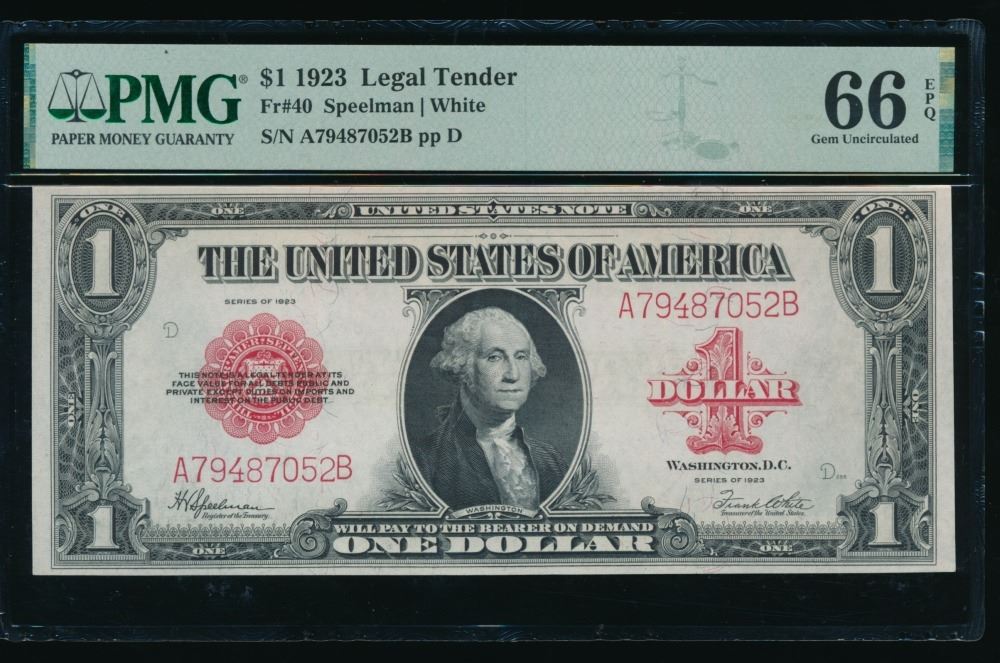 One 1923 $1 Legal Tender Note PMG 66EPQ.