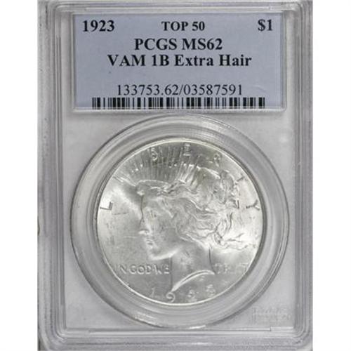 <B>1923 $1 MS62 PCGS.</B></I> Vam-1B, Extra Hair, Top 50. PCGS Population (12/16). NGC Census: (0/0). (#133753)<BR><BR><b>Shipping:</b> Coins & Currency (<a target="_blank" href="http://www.heritageauctions.com/common/shipping.php">view shipping information</a>)