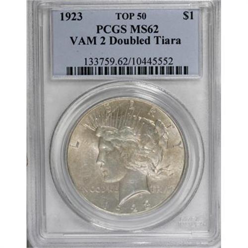 <B>1923 $1 MS62 PCGS.</B></I> Vam-2, Doubled Tiara, Top 50. PCGS Population (9/16). NGC Census: (0/0). (#133759)<BR><BR><b>Shipping:</b> Coins & Currency (<a target="_blank" href="http://www.heritageauctions.com/common/shipping.php">view shipping information</a>)