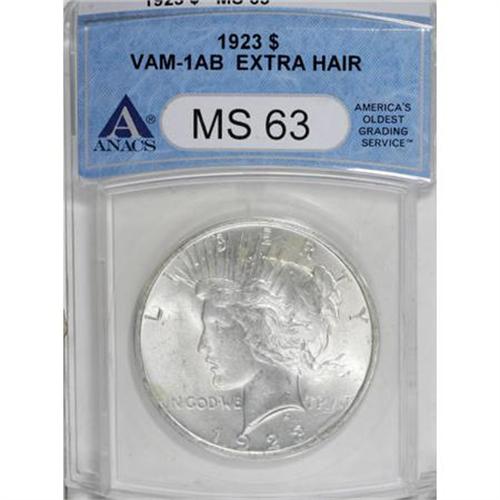 <B>1923 $1 MS63 ANACS.</B></I> Vam-1AB Extra Hair. NGC Census: (38185/115870). PCGS Population (34712/65360). Mintage: 30,800,000. Numismedia Wsl. Price for NGC/PCGS coin in MS63: $25. (#7360)<BR><BR><B>Coin Engraver:</B> Anthony de Francisci<BR><BR><b>Shipping:</b> Coins & Currency (<a target="_blank" href="http://www.heritageauctions.com/common/shipping.php">view shipping information</a>)