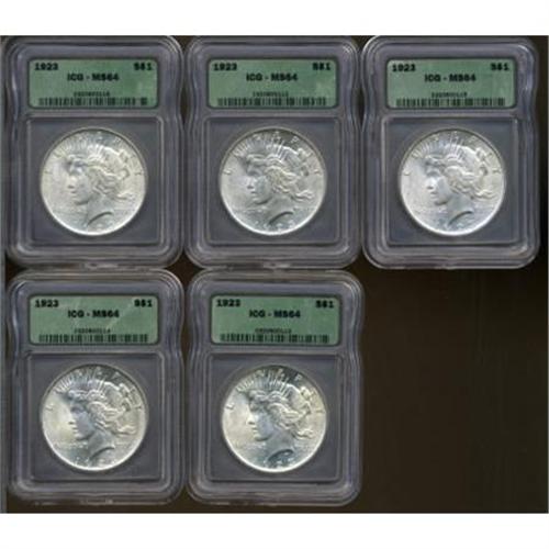 <B>(5) 1923 $1 MS64 ICG.</B></I> NGC Census: (91453/24417). PCGS Population (51468/13388). Mintage: 30,800,000. Numismedia Wsl. Price for NGC/PCGS coin in MS64: $42. (#7360)<BR><BR><B>Coin Engraver:</B> Anthony de Francisci<BR><BR><b>Shipping:</b> Coins & Currency (<a target="_blank" href="http://www.heritageauctions.com/common/shipping.php">view shipping information</a>)