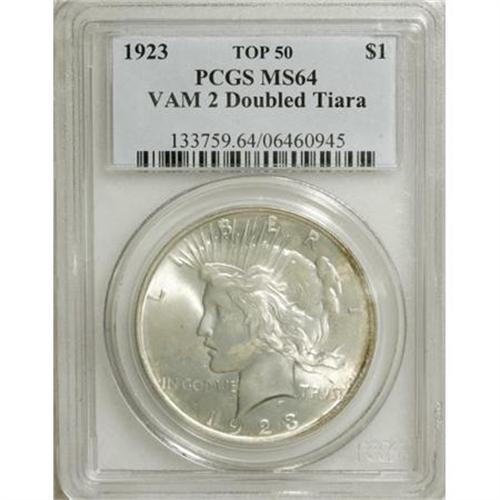 <B>1923 $1 MS64 PCGS.</B></I> Vam 2, Doubled Tiara, Top 50. PCGS Population (5/2). NGC Census: (0/0). (#133759)<BR><BR><b>Shipping:</b> Coins & Currency (<a target="_blank" href="http://www.heritageauctions.com/common/shipping.php">view shipping information</a>)