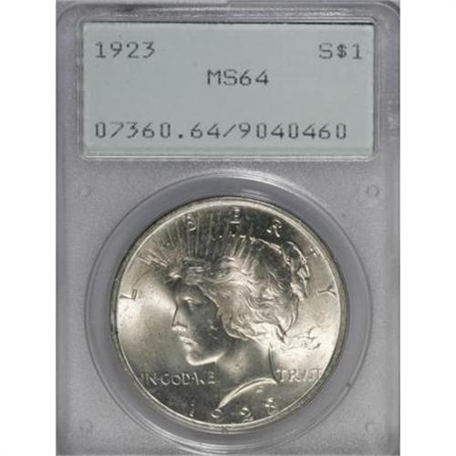 <B>1923 $1 MS64 PCGS.</B></I> PCGS Population (52425/13804). NGC Census: (94224/25118). Mintage: 30,800,000. Numismedia Wsl. Price for NGC/PCGS coin in MS64: $43. (#7360)<BR><BR><B>Coin Engraver:</B> Anthony de Francisci<BR><BR><b>Shipping:</b> Coins & Currency (<a target="_blank" href="http://www.heritageauctions.com/common/shipping.php">view shipping information</a>)