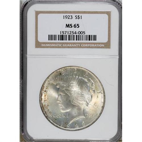 <B>1923 $1 MS65 NGC.</B></I> NGC Census: (22906/1450). PCGS Population (11997/1380). Mintage: 30,800,000. Numismedia Wsl. Price for NGC/PCGS coin in MS65: $128. (#7360)<BR><BR><B>Coin Engraver:</B> Anthony de Francisci<BR><BR><b>Shipping:</b> Coins & Currency (<a target="_blank" href="http://www.heritageauctions.com/common/shipping.php">view shipping information</a>)
