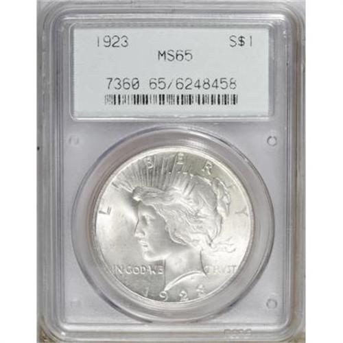 <B>1923 $1 MS65 PCGS.</B></I> PCGS Population (12102/1413). NGC Census: (23461/1525). Mintage: 30,800,000. Numismedia Wsl. Price for NGC/PCGS coin in MS65: $135. (#7360)<BR><BR><B>Coin Engraver:</B> Anthony de Francisci<BR><BR><b>Shipping:</b> Coins & Currency (<a target="_blank" href="http://www.heritageauctions.com/common/shipping.php">view shipping information</a>)