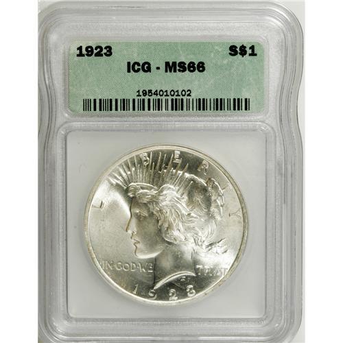 <B>1923 $1 MS66 ICG.</B></I> NGC Census: (1355/41). PCGS Population (1301/51). Mintage: 30,800,000. Numismedia Wsl. Price: $580. (#7360)<BR><BR><b>Shipping:</b> Coins & Currency (<a target="_blank" href="http://www.heritageauctions.com/common/shipping.php">view shipping information</a>)