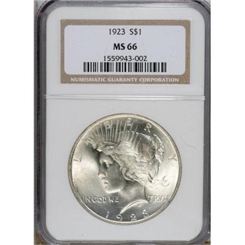 <B>1923 $1 MS66 NGC.</B></I> NGC Census: (1387/42). PCGS Population (1303/51). Mintage: 30,800,000. Numismedia Wsl. Price for NGC/PCGS coin in MS66: $570. (#7360)<BR><BR><b>Shipping:</b> Coins & Currency (<a target="_blank" href="http://www.heritageauctions.com/common/shipping.php">view shipping information</a>)