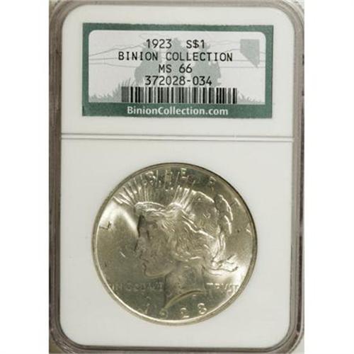 <B>1923 $1 MS66 NGC.</B></I> Ex: Binion Collection. NGC Census: (1399/42). PCGS Population (1303/51). Mintage: 30,800,000. Numismedia Wsl. Price for NGC/PCGS coin in MS66: $570. (#7360)<BR><BR><b>Shipping:</b> Coins & Currency (<a target="_blank" href="http://www.heritageauctions.com/common/shipping.php">view shipping information</a>)