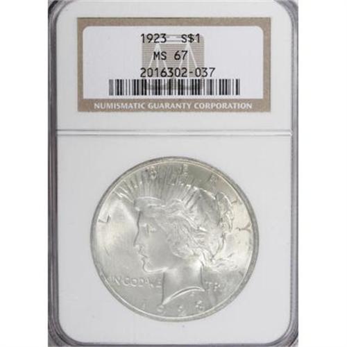 <B>1923 $1 MS67 NGC.</B></I> At the Superb Gem level, the population of the otherwise relatively available 1923 Peace dollar comes to a grinding halt. With no representative of the issue graded finer by NGC, we recommend this piece to the advanced Registry Set collector. Ice-white color is seen beneath thick, frosty cartwheel luster. The surfaces are essentially free from bothersome abrasions. Exceptional eye appeal. Census: 50 in 67, 0 finer (1/08).<BR><BR><B>Coin Engraver:</B> Anthony de Francisci<BR><BR><b>Shipping:</b> Coins & Currency (<a target="_blank" href="http://www.heritageauctions.com/common/shipping.php">view shipping information</a>)