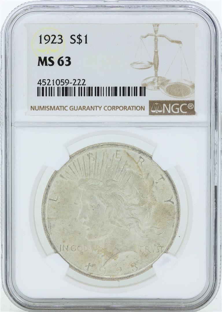 One 1923 $1 Peace Silver Dollar Coin NGC MS63. NGC Certified.