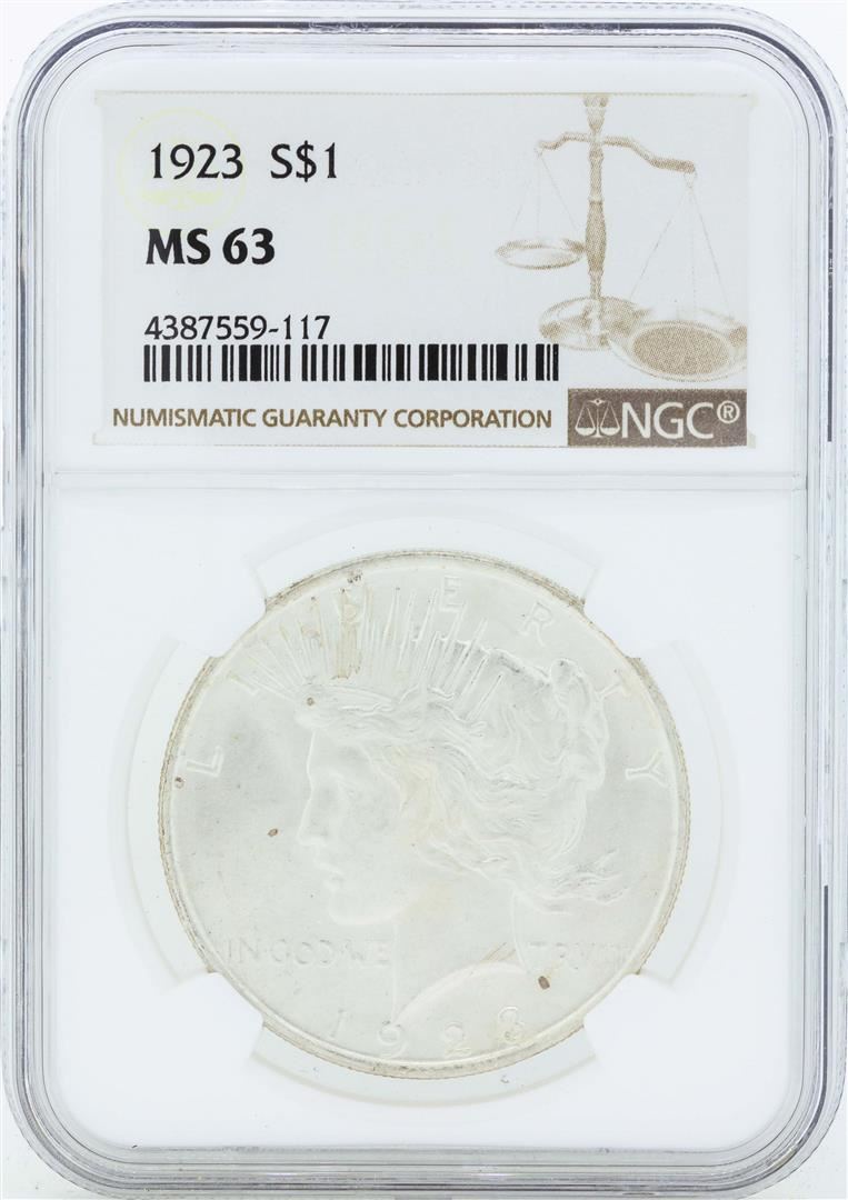 One 1923 $1 Peace Silver Dollar Coin NGC MS63. NGC Certified.