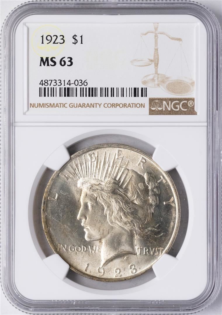 One 1923 $1 Peace Silver Dollar Coin NGC MS63. NGC Certified.
