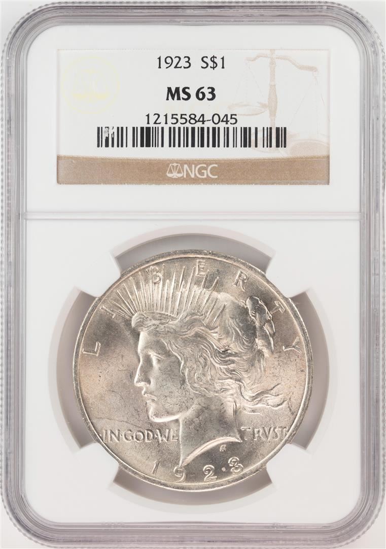 One 1923 $1 Peace Silver Dollar Coin NGC MS63. NGC Certified.