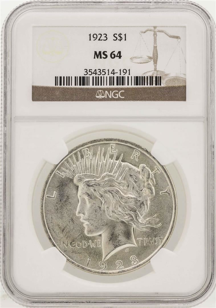 One 1923 $1 Peace Silver Dollar Coin NGC MS64. NGC Certified.