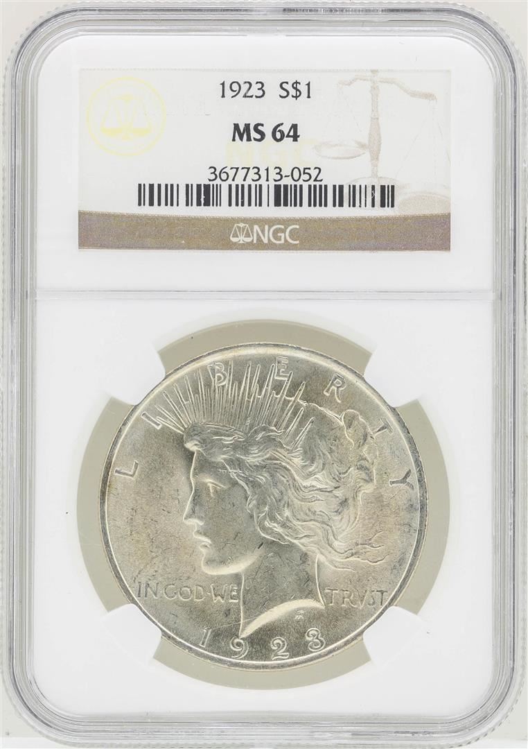One 1923 $1 Peace Silver Dollar Coin NGC MS64. NGC Certified.