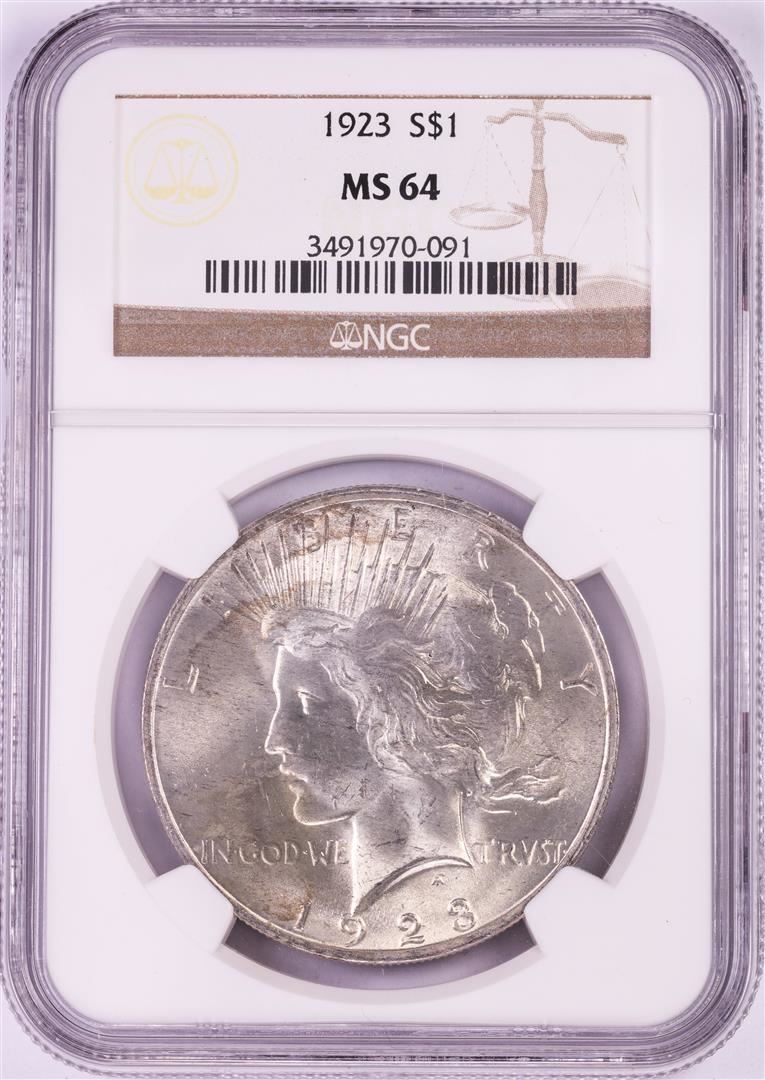One 1923 $1 Peace Silver Dollar Coin NGC MS64. NGC Certified.