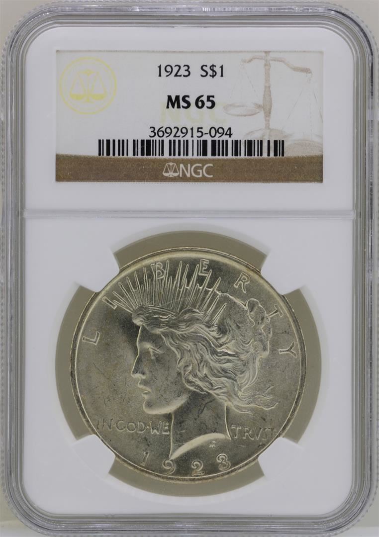 One 1923 $1 Peace Silver Dollar Coin NGC MS65. NGC Certified.