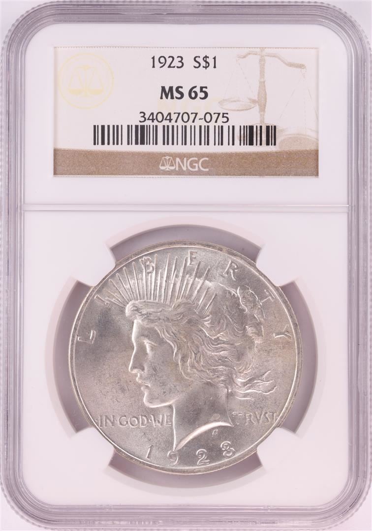 One 1923 $1 Peace Silver Dollar Coin NGC MS65. NGC Certified.