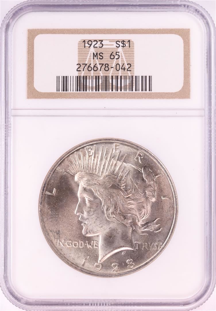 One 1923 $1 Peace Silver Dollar Coin NGC MS65. NGC Certified.
