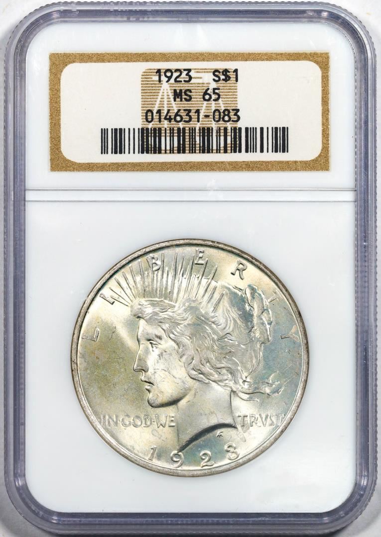One 1923 $1 Peace Silver Dollar Coin NGC MS65. NGC Certified.