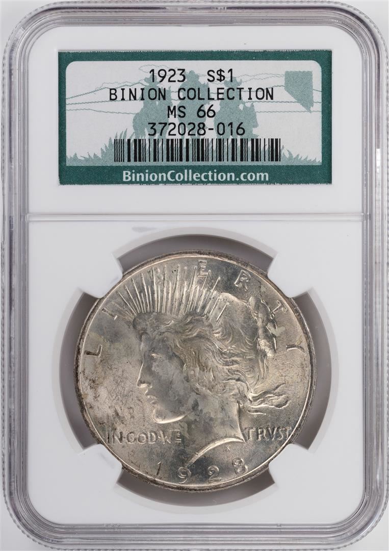 One 1923 $1 Peace Silver Dollar Coin NGC MS66 Binion Collection. NGC Certified.