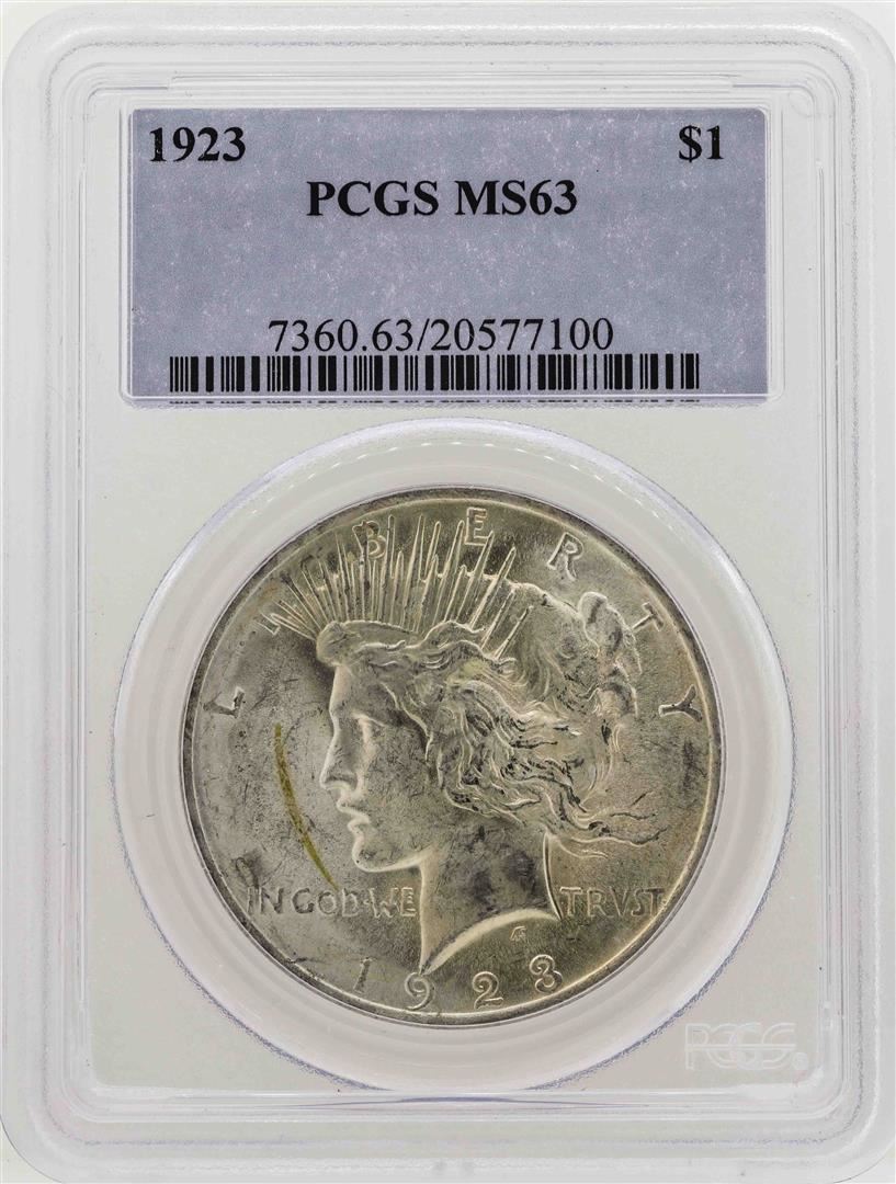 One 1923 $1 Peace Silver Dollar Coin PCGS MS63. PCGS Graded.