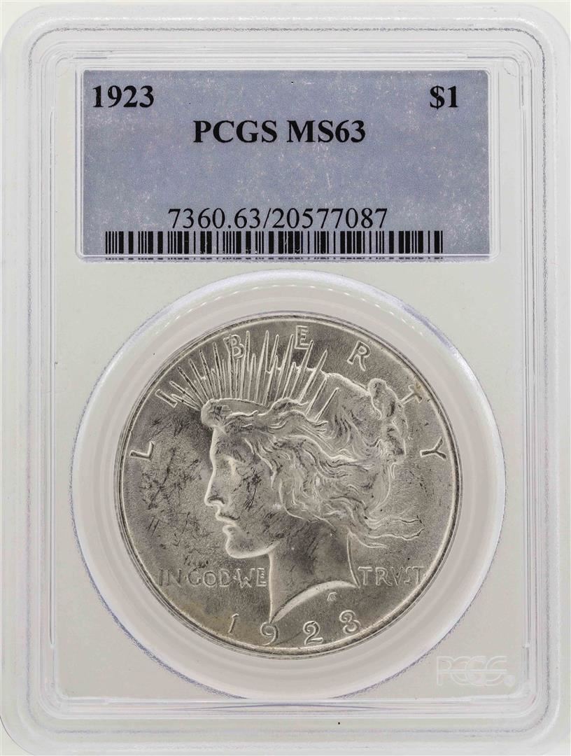 One 1923 $1 Peace Silver Dollar Coin PCGS MS63. PCGS Graded.