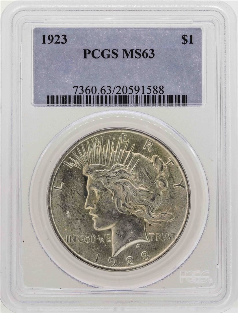One 1923 $1 Peace Silver Dollar Coin PCGS MS63. PCGS Graded.