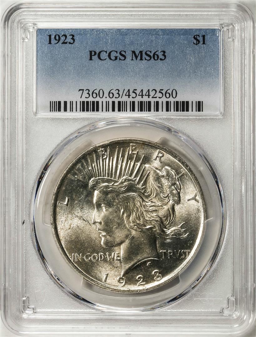 One 1923 $1 Peace Silver Dollar Coin PCGS MS63. PCGS Graded.