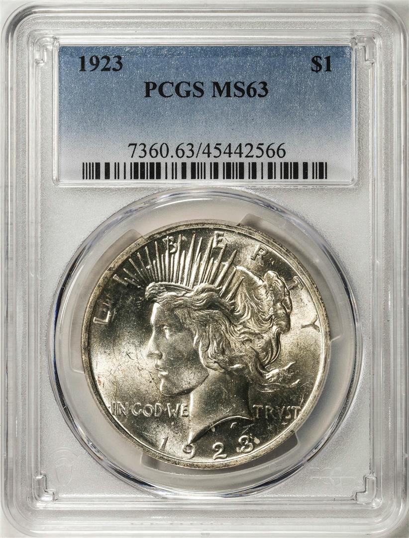 One 1923 $1 Peace Silver Dollar Coin PCGS MS63. PCGS Graded.