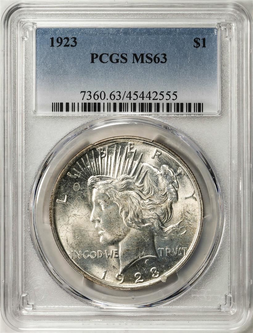 One 1923 $1 Peace Silver Dollar Coin PCGS MS63. PCGS Graded.